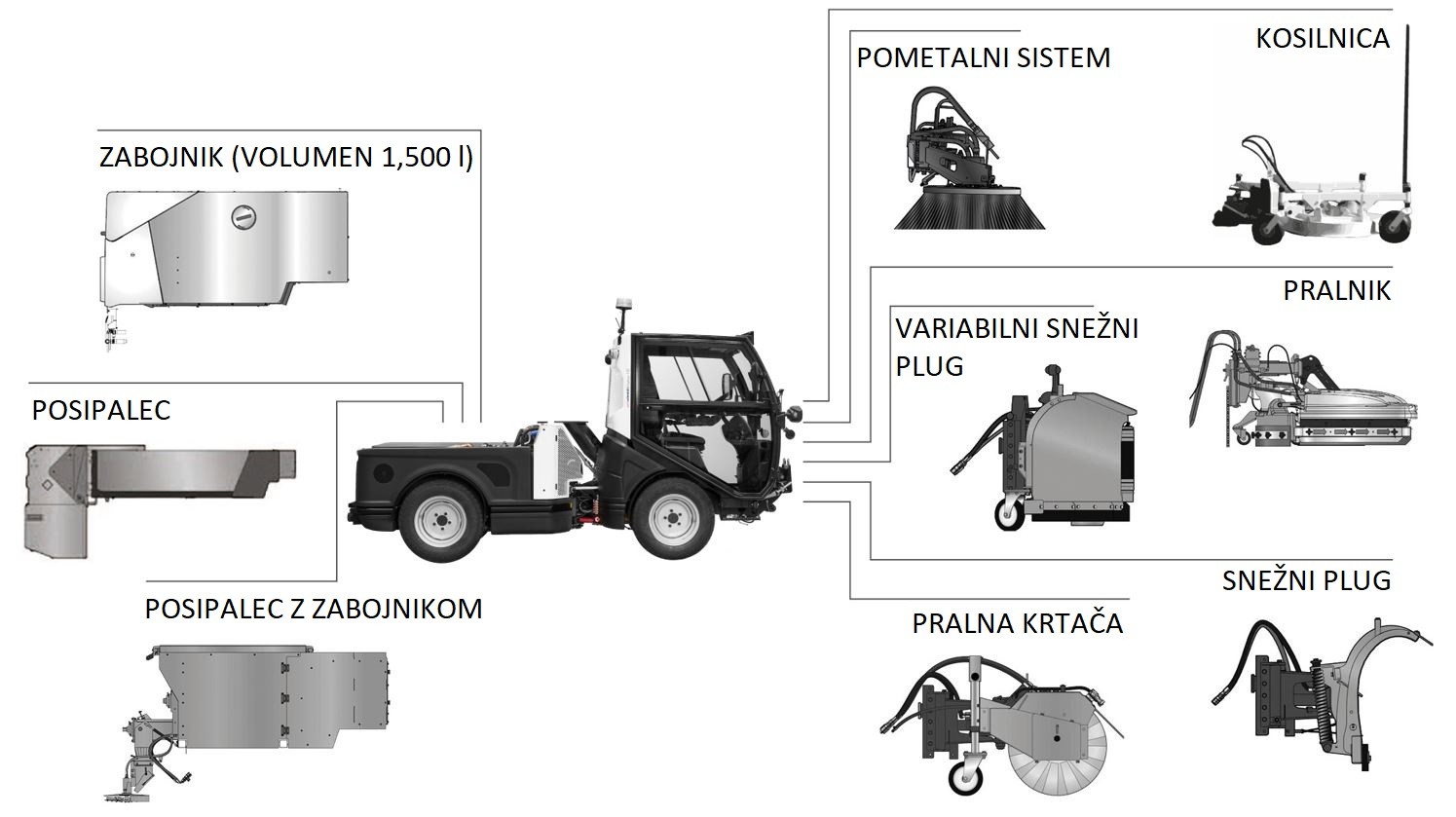 Pometalni stroj s kapaciteto 1.5 m3 lahko po želji opremite s snežnim plugom, posipalcem, kosilno napravo ali katerim drugim priključkom, odvisno od vaših zahtev.