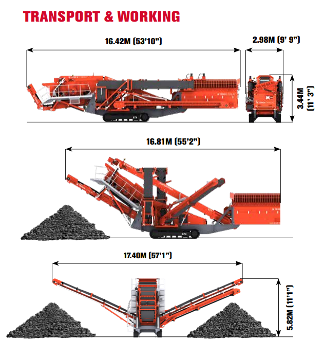 - Četrti transportni trak (oversize plus) omogoča spremenljivo sposobnost nagiba in drsenja, da lahko materiale za recirkulacijo na drobilnike ali za skladiščenje natančno izprazni.